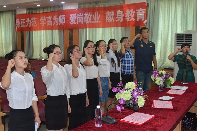 随后亚琴主任带领全体青年教师宣读誓词。青年教师代表王伟宣读《教师师德承诺书》,全体青年教师签署承诺书并交由乌仁图亚副书记签字。