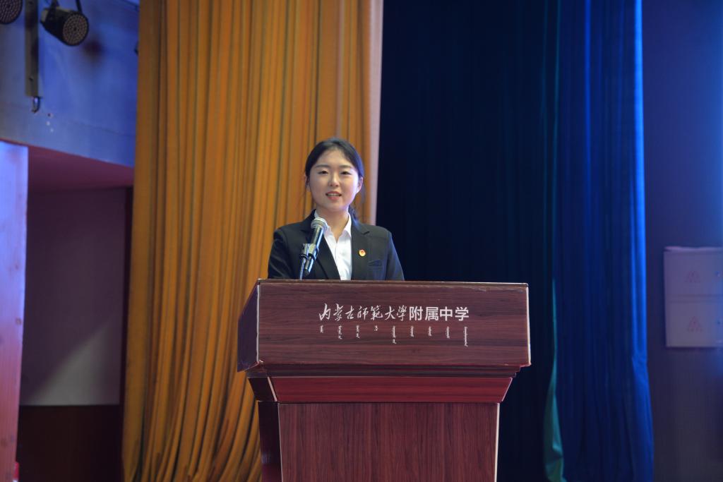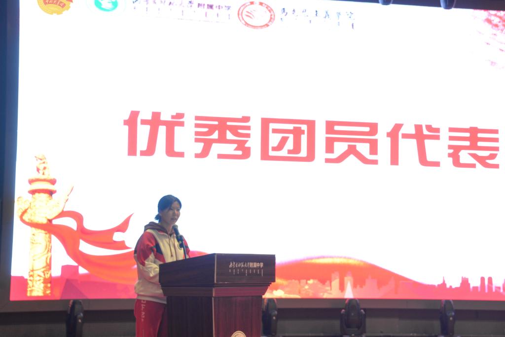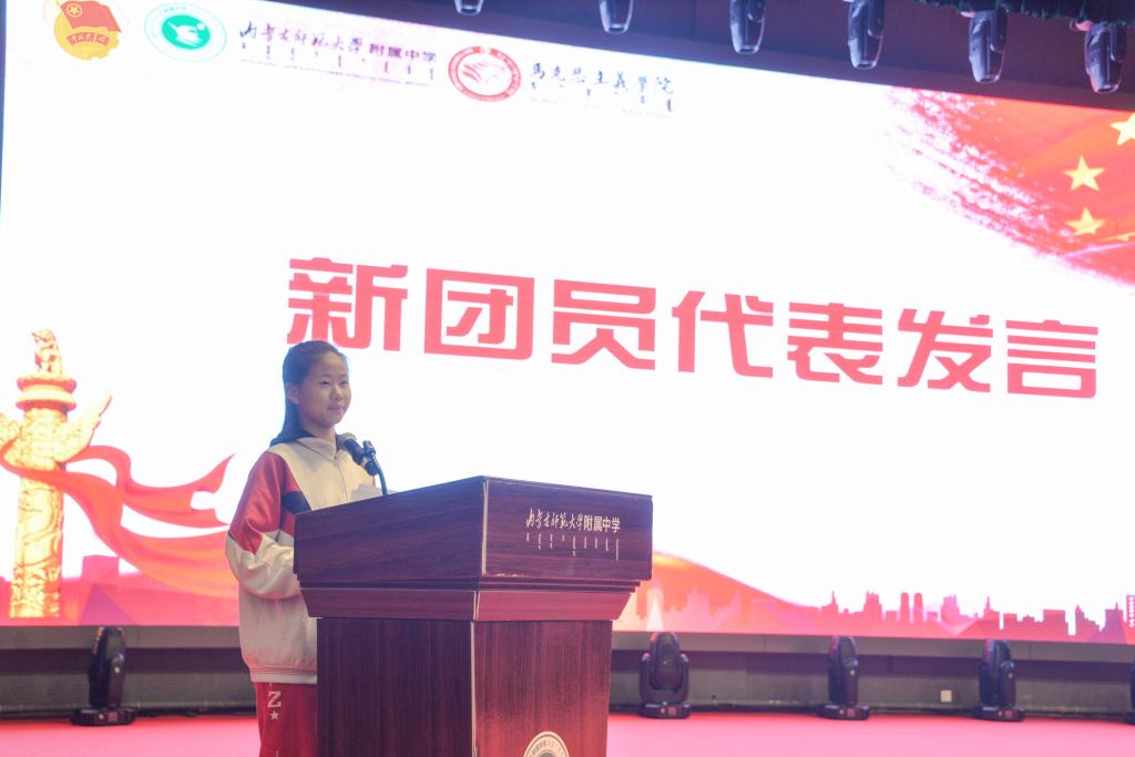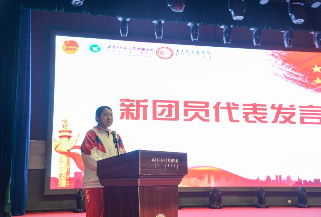 包双成、王丹、萨日娜、刘绪才为新入团团员颁发团员证与团徽;我校副校长霍俊国宣读团员权利与义务;团委书记周瑶带领新入团团员宣誓;2022级初三5班张伊柯、2023级高二8班黄家慧作为新团员代表,2022级高三4班包宇阳作为优秀团员代表进行发言。同时内蒙古师范大学马克思主义学院2023级哲学班杨淼就一二·九运动纪念日为大家带来一节精彩的团课。