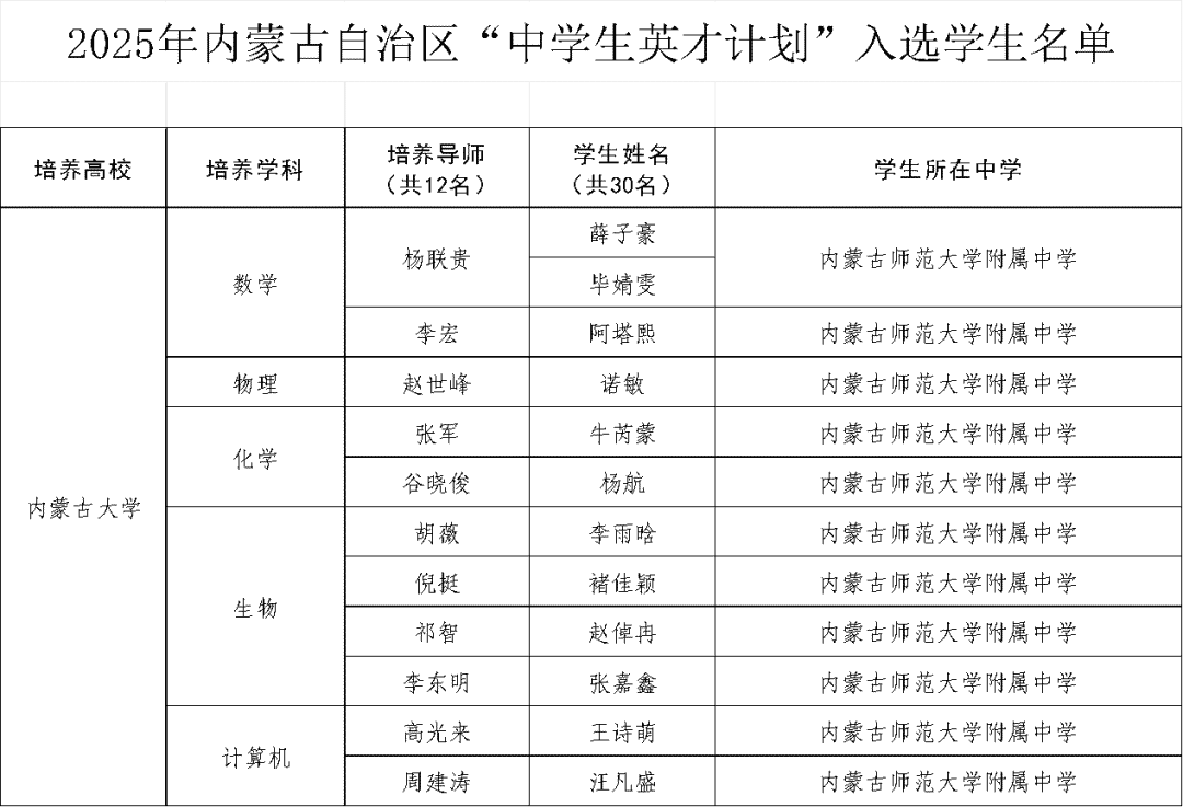 近日,由内蒙古自治区“中学生英才计划”管理办公室和内蒙古大学联合开展的2025年内蒙古自治区“中学生英才计划”选拔活动落下帷幕。经学科潜质测试和导师面试,最终共有30名学生入选2025年内蒙古自治区“中学生英才计划”,其中我校学生有12名同学成功入选。