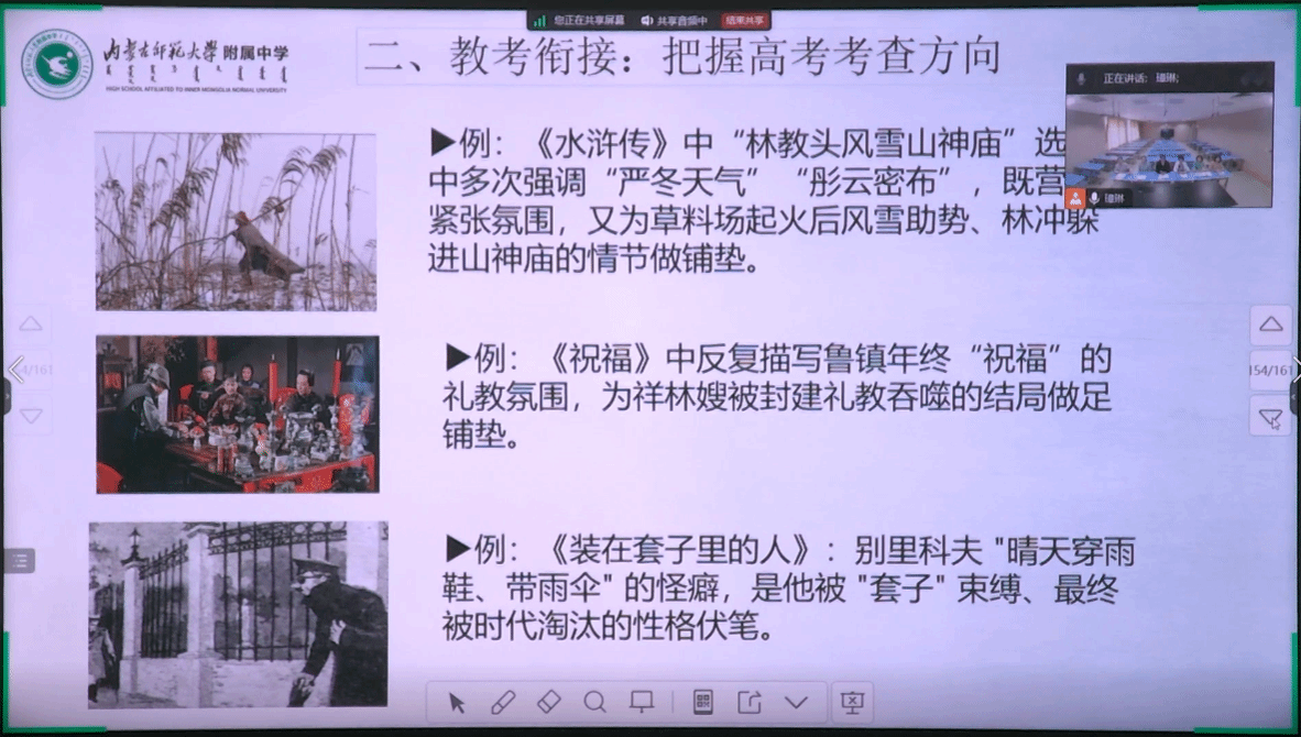 为深化国家统编教材研究,推动高中语文教学创新,5月28日,我校高二年级语文教学团队应邀参与内蒙古自治区“国家课程集体备课”活动。通过线上线下联动,全区中学语文教师共同观摩了这场思想碰撞与智慧交融的教研盛宴。