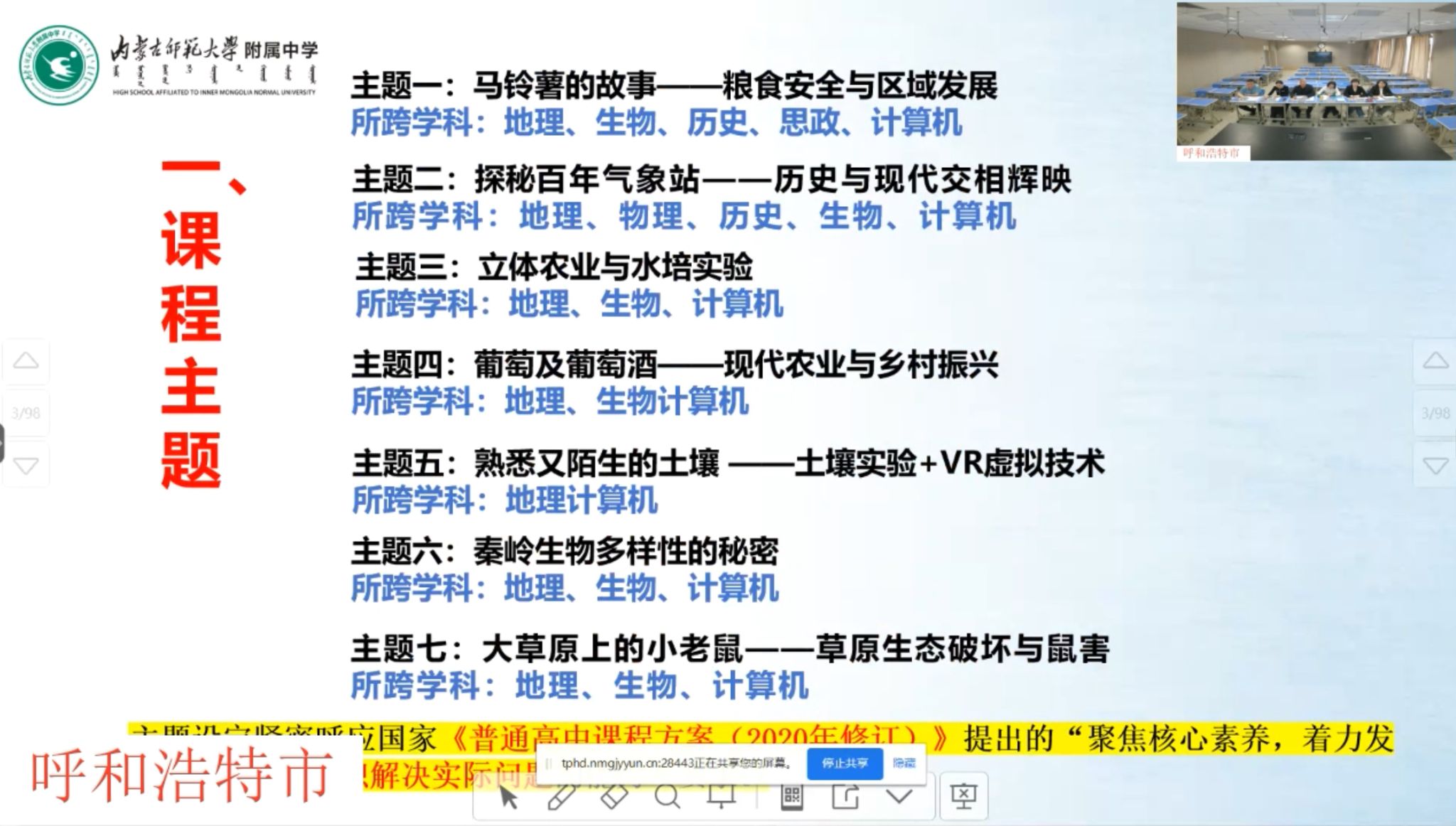 本次在线教研活动由基础教育各学段的三所学校分享交流了自治区课程建设实验校课程建设实施情况及跨学科项目化学习案例,旨在展示呼和浩特教育团队在课程建设领域的创新做法及成果,活动全程通过内蒙古中小学智慧教育平台全程直播,全区资源共享。